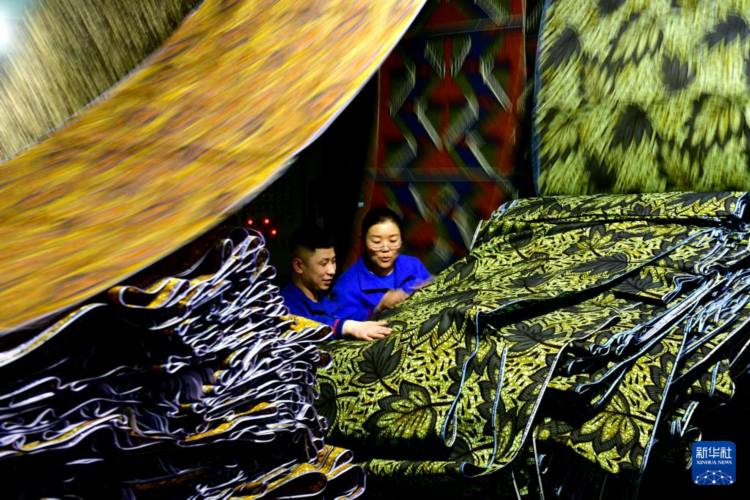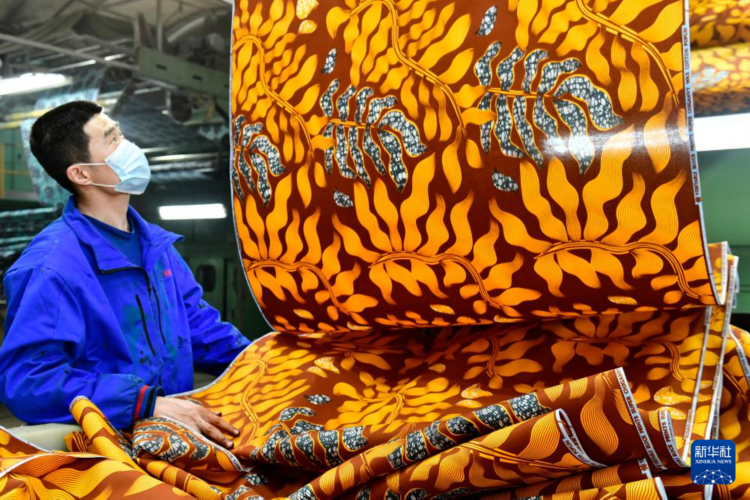 2月25日,在愉悦家纺有限公司蜡染车间,工作人员在查看出口非洲的布匹。