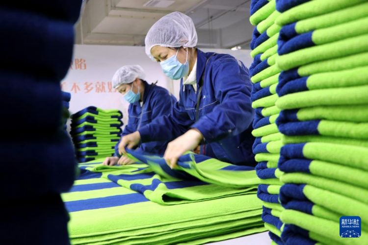 2月26日,在滨州亚光家纺有限公司,工作人员在整理产品。