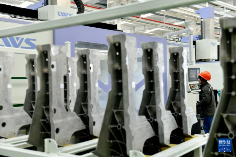 2月26日,在山东宏灿材料科技有限公司,工人在加工汽车轻量化精密铝合金结构件的机床前值守。