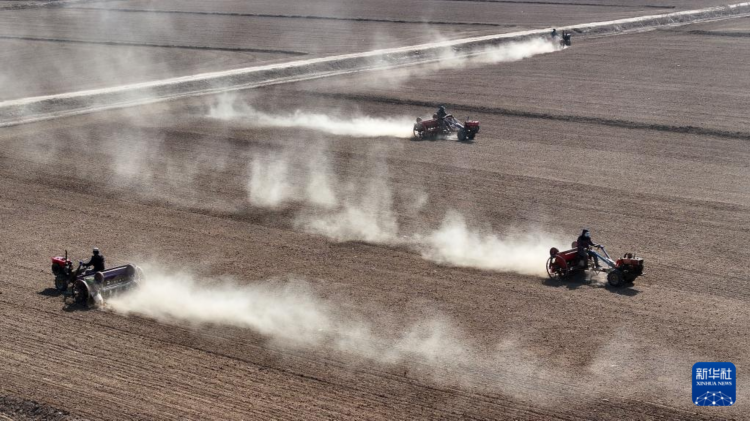 2月26日,在银川市贺兰县立岗镇通伏村,农户在田间播种小麦(无人机照片)。