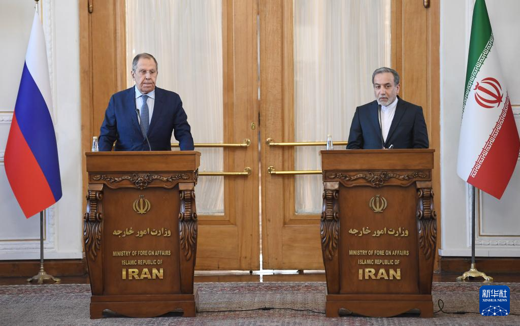 2月25日,在伊朗德黑兰,伊朗外交部长阿拉格齐(右)与俄罗斯外长拉夫罗夫出席联合新闻发布会。