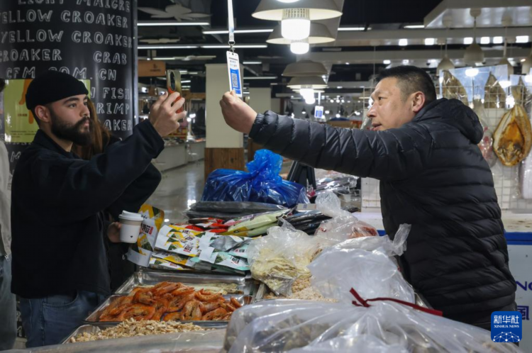 2月27日,外国顾客在舟山国际水产城扫二维码购买水产品。
