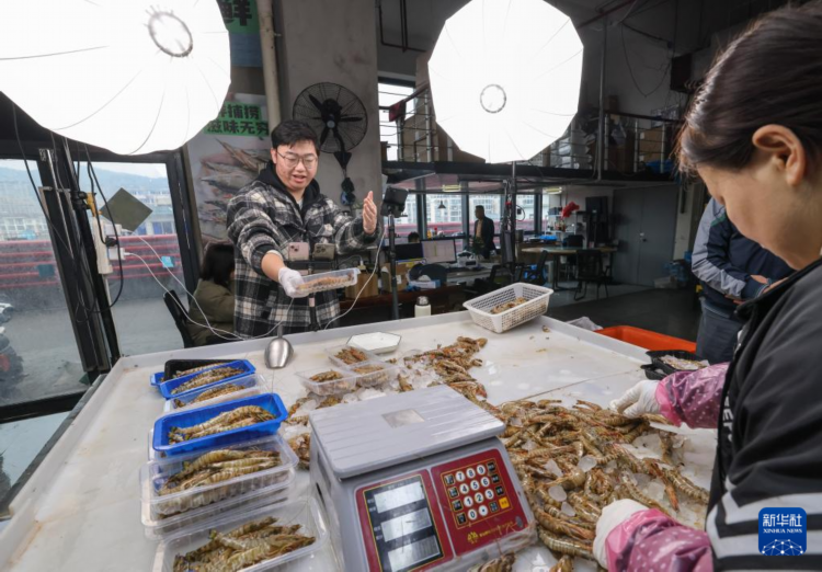 2月27日,在舟山国际水产城,一名商户在直播卖水产品。