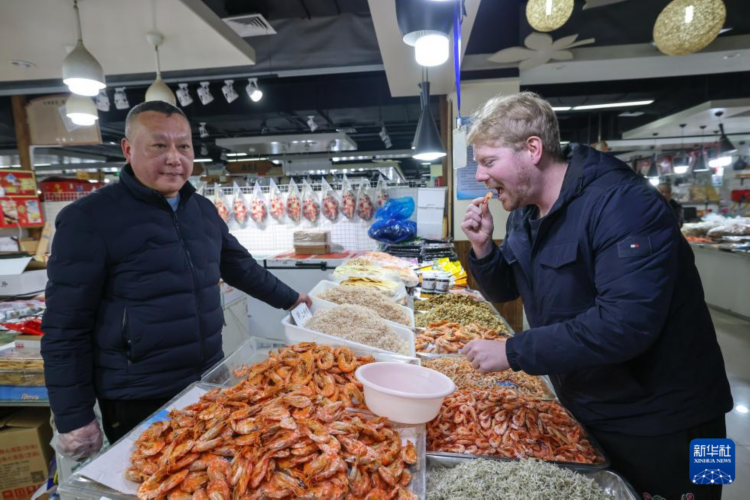 2月27日,外国顾客在舟山国际水产城试吃水产品。