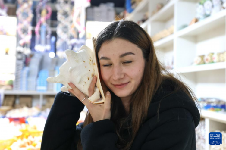 2月27日,一名外国女孩在舟山国际水产城倾听海螺的回声。