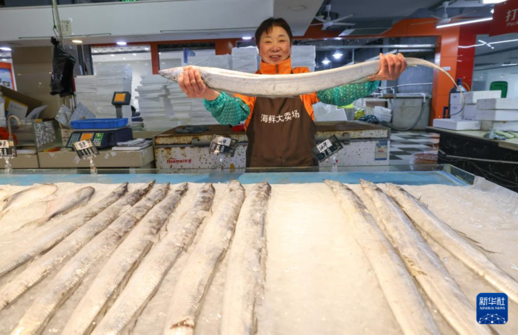 2月27日,一名舟山国际水产城的商户在展示舟山带鱼。