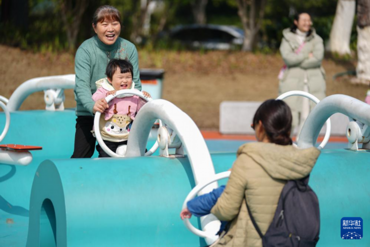 2月27日,市民带着小朋友在长沙市银杏公园玩耍。