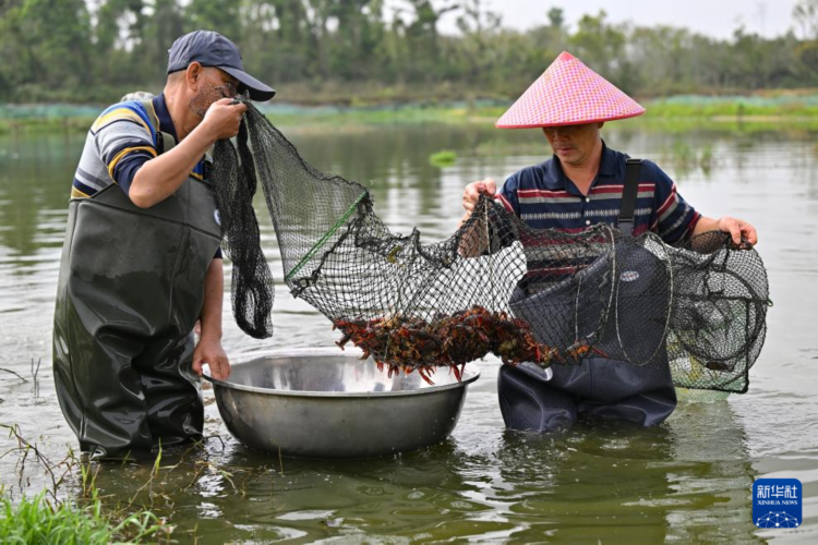 2月27日,海口大塘稻虾综合种养科技示范基地的工作人员在捕捞小龙虾。