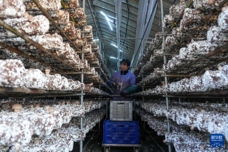 2月27日,淄博一家食用菌种植合作社员工在采摘香菇。