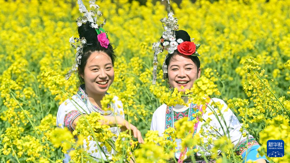 3月1日,在广西三江侗族自治县梅林乡,侗族群众在花海中游玩。