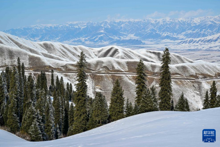 一场降雪过后,位于新疆伊犁哈萨克自治州新源县的新疆那拉提国家旅游度假区一片银装素裹。连绵起伏的草坡被白雪覆盖,巍峨的山峰格外壮观。松林在冰雪中屹立,阳光洒落,美不胜收。