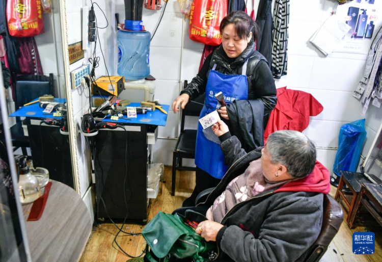 杨翠云在理发店里给顾客理发(2月28日摄)。