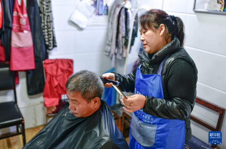 杨翠云在理发店里给顾客理发(2月28日摄)。