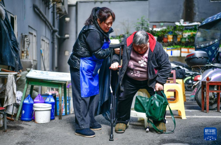 杨翠云搀扶一名行动不便的顾客坐下休息(2月28日摄)。