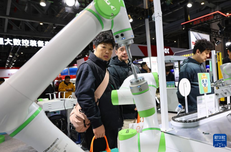 3月3日,参观者在一个进行作业演示的双臂协同机器人前驻足观看。