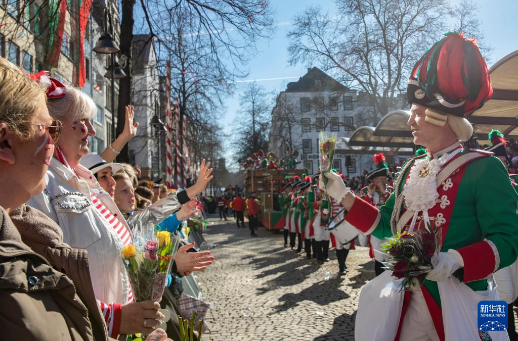 3月3日,在德国科隆,一名“玫瑰星期一”大游行的参加者将鲜花递给观众。 当天,德国科隆举办“玫瑰星期一”大游行,掀起科隆狂欢节的高潮。科隆狂欢节是德国规模最大的狂欢节。 新华社记者 张帆 摄