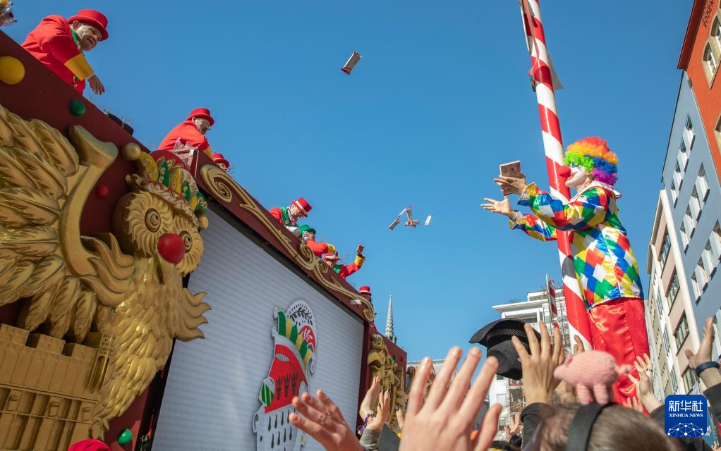 3月3日,在德国科隆,“玫瑰星期一”大游行的参加者在花车上向观众抛撒糖果。 当天,德国科隆举办“玫瑰星期一”大游行,掀起科隆狂欢节的高潮。科隆狂欢节是德国规模最大的狂欢节。 新华社记者 张帆 摄