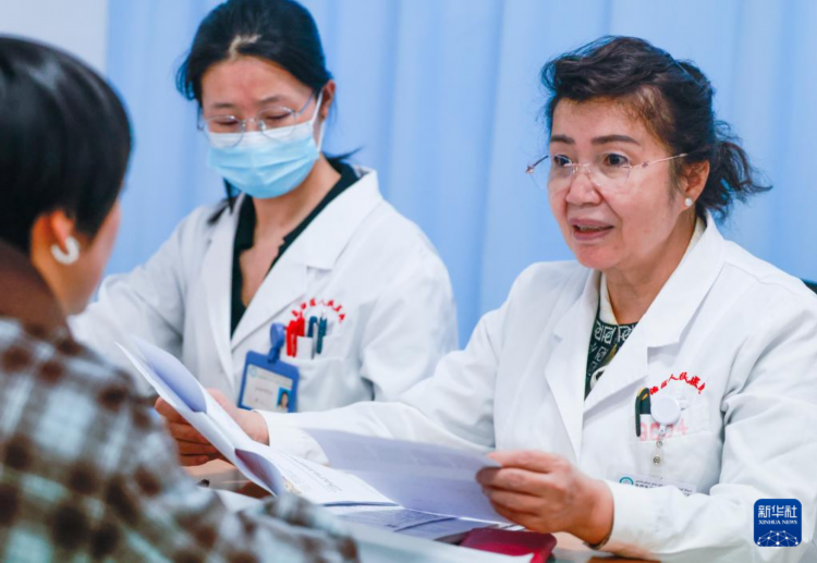 3月3日,玛依努尔·尼牙孜(右)在新疆维吾尔自治区人民医院为患者诊疗。
