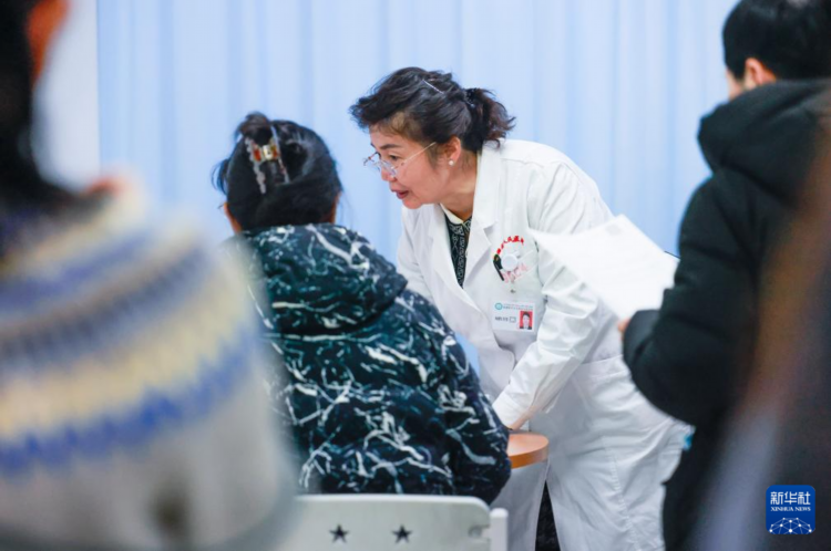 3月4日,在新疆维吾尔自治区妇幼保健院病房,玛依努尔·尼牙孜(左二)查房时与医护人员交流。