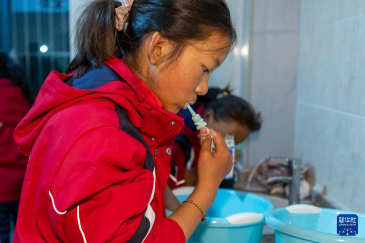 3月5日,来自受灾最严重的定日县长所乡、措果乡、曲洛乡的3所小学的学生在定日县委党校分流安置点洗漱。