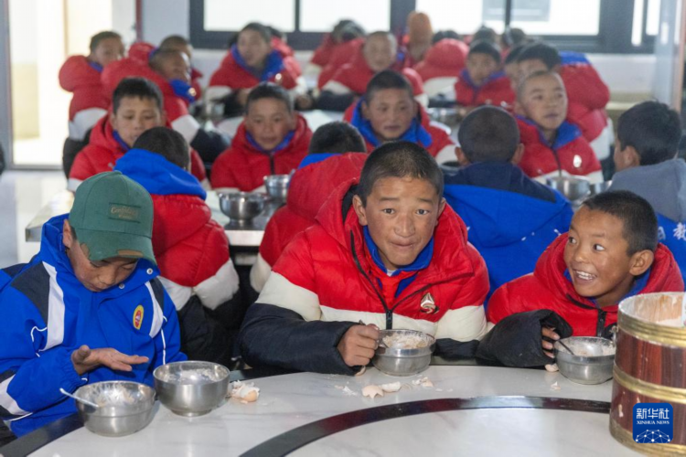 3月5日,来自受灾最严重的定日县长所乡、措果乡、曲洛乡的3所小学的学生在定日县委党校分流安置点吃早饭。