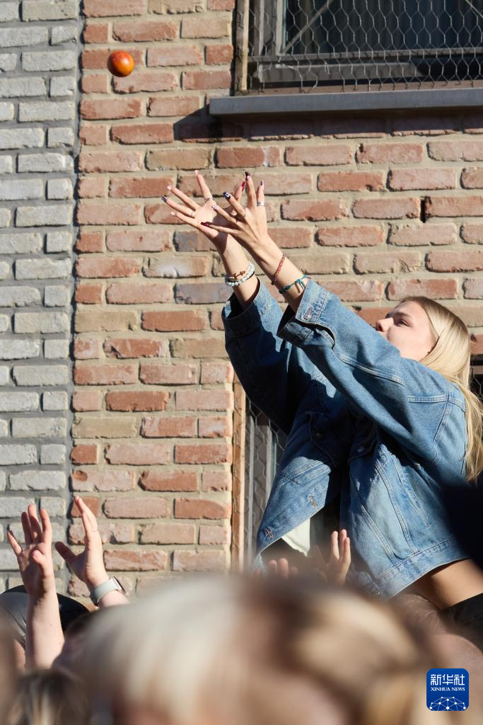 3月4日,在比利时南部小镇班什,一名游客在“血橙盛典”上接抛来的血橙。 当日,比利时班什狂欢节迎来“血橙盛典”,装扮成“憨人”“水手”“农夫”“小丑”等形象的当地居民把代表幸运的血橙抛向人群中,将节日气氛推至最高潮。 新华社记者 孟鼎博 摄