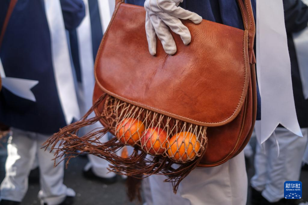 这是3月4日在比利时南部小镇班什拍摄的一名装扮成“农夫”形象的狂欢节参加者随身携带的血橙。 当日,比利时班什狂欢节迎来“血橙盛典”,装扮成“憨人”“水手”“农夫”“小丑”等形象的当地居民把代表幸运的血橙抛向人群中,将节日气氛推至最高潮。 新华社记者 孟鼎博 摄