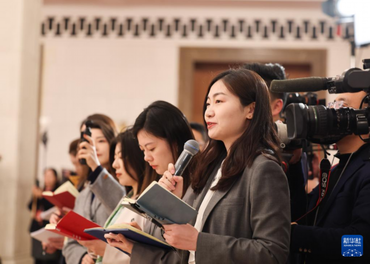 3月7日,全国政协十四届三次会议第二场“委员通道”集体采访活动在北京人民大会堂举行。这是记者在提问。