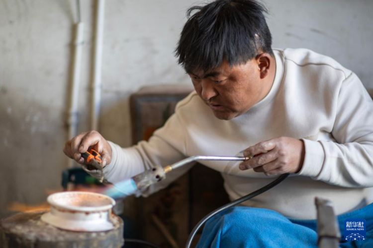 3月6日,扎西吉彩的手工匠人在给银器塑形。