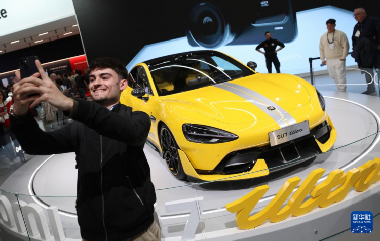 3月6日,在西班牙巴塞罗那举行的2025年世界移动通信大会上,一名男子和小米汽车留影。新华社记者 赵丁喆 摄
