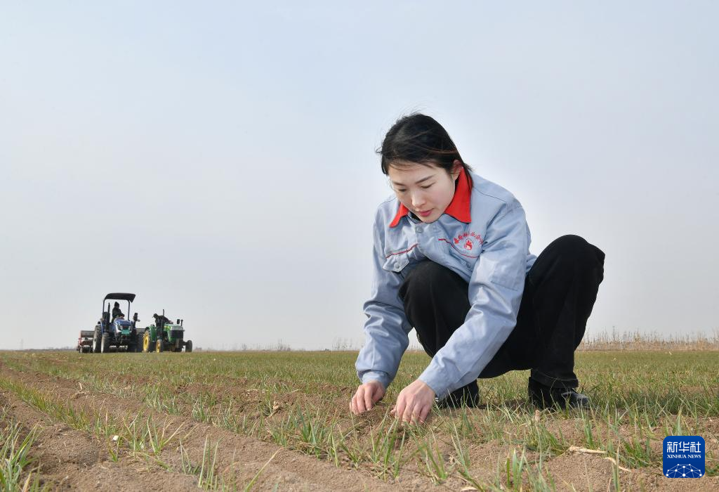 3月7日,张宸在麦田里观察麦苗长势。