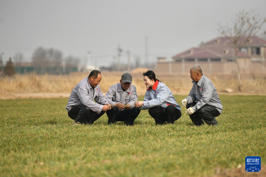 3月7日,张宸(右二)指导合作社社员进行小麦田间管理。