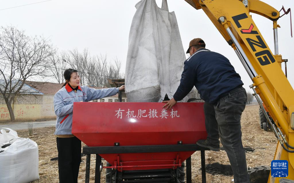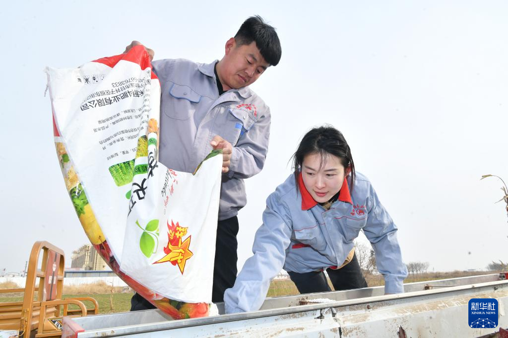 3月7日,张宸(左)为安装了北斗导航辅助驾驶设备的农机添加用于改良盐碱地的肥料。