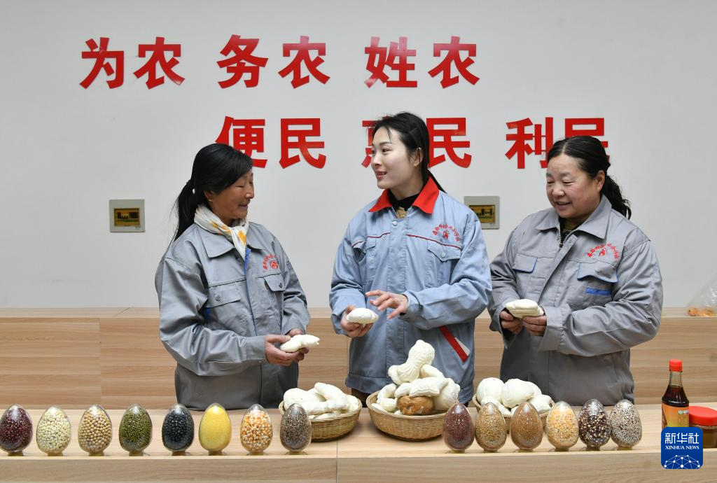 3月7日,张宸(中)与合作社社员交流旱碱麦面花的销售情况。