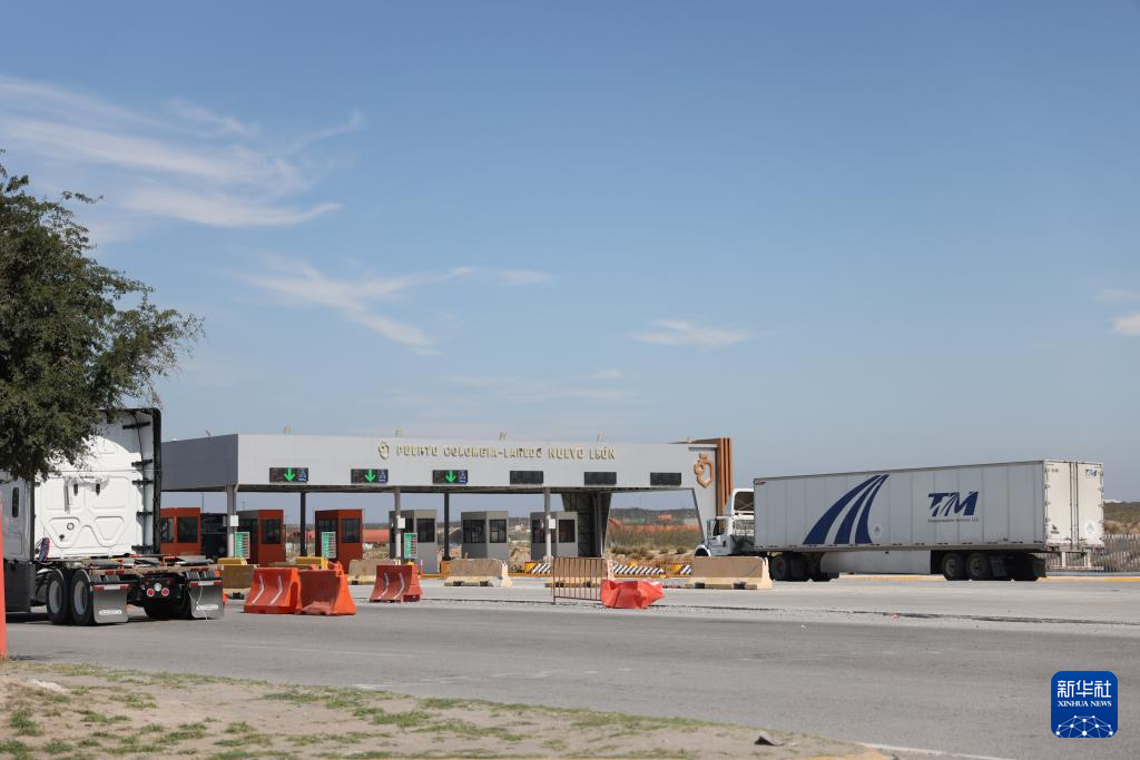 2月15日,在墨西哥新莱昂州哥伦比亚镇,货车通过一处边检站,通过后将从国际桥跨越格兰德河,进入美国。