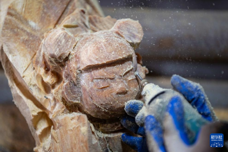 3月10日,在伊春永达工艺品有限公司,手艺人在雕刻哪吒主题的北沉香工艺品。