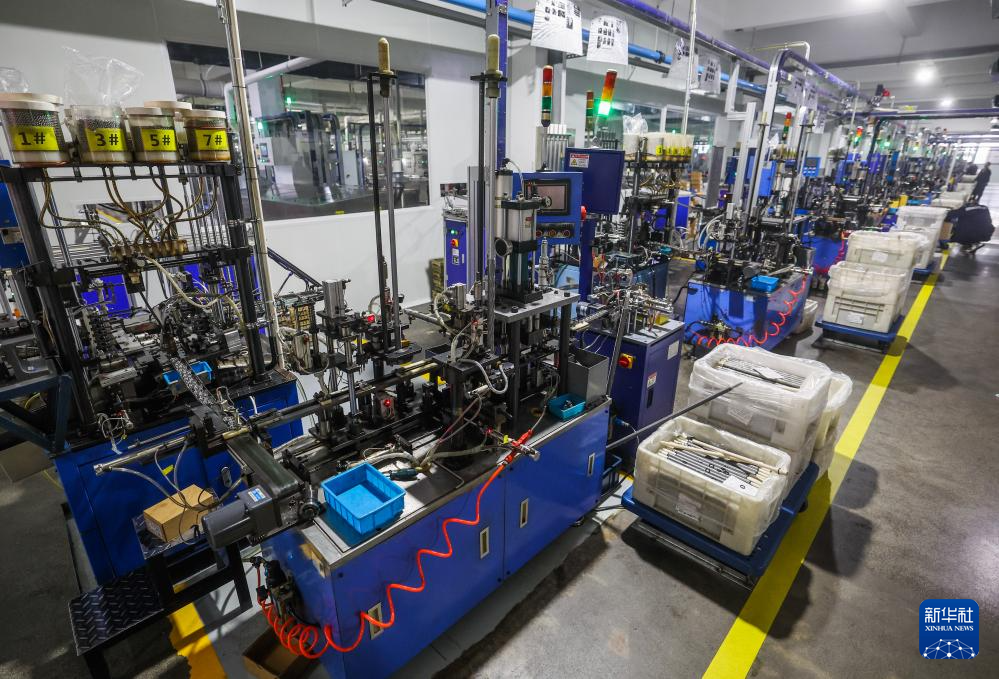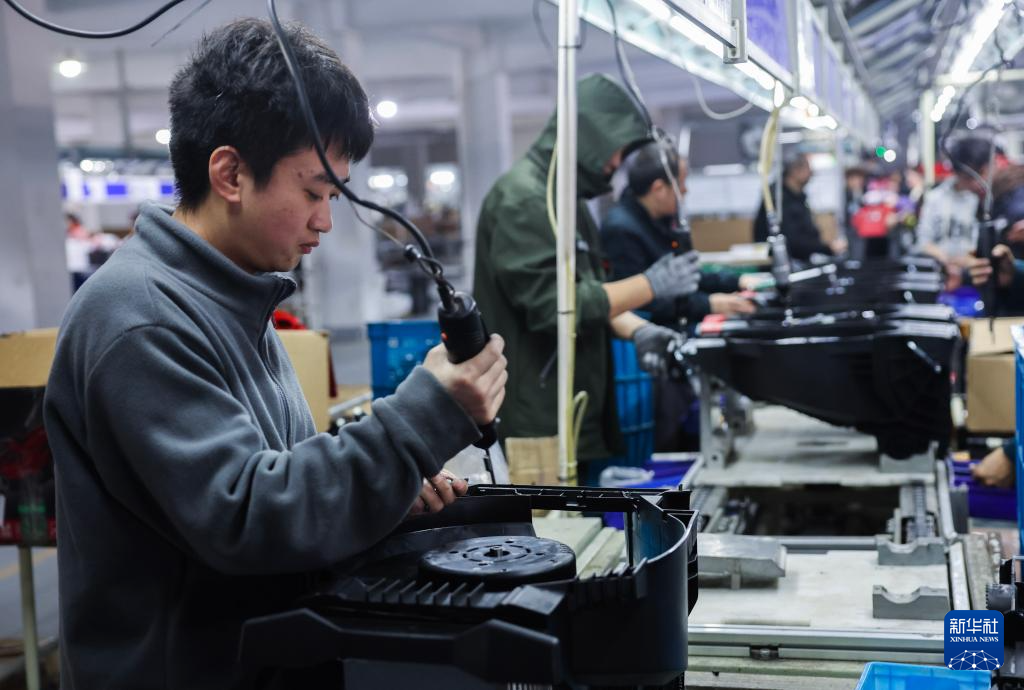 3月11日,在位于慈溪市横河镇的宁波好使特电器有限公司的车间内,工人在流水线上组装一批出口的园林工具。