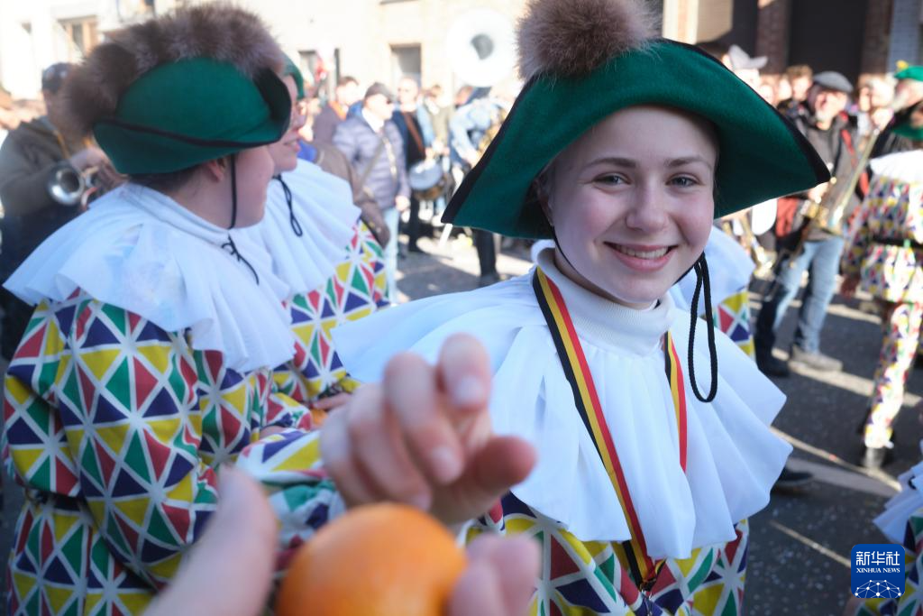 比利时班什狂欢节迎来“血橙盛典” 3月4日,在比利时南部小镇班什,一名装扮成“小丑”形象的女子为游客分发血橙。 当日,比利时班什狂欢节迎来“血橙盛典”,装扮成“憨人”“水手”“农夫”“小丑”等形象的当地居民把代表幸运的血橙抛向人群中,将节日气氛推至最高潮。 新华社记者 孟鼎博 摄