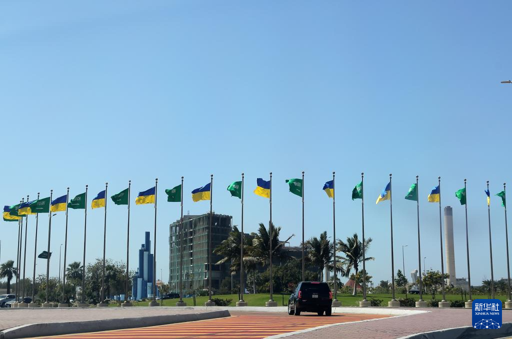 3月10日,在沙特阿拉伯吉达,沙特阿拉伯和乌克兰两国的国旗在道路旁飘扬。