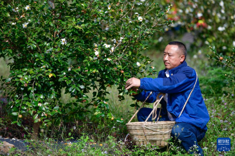 吴光荣在贵州省龙里县颐光山林油茶生态园里采摘油茶果(2024年10月15日摄)。