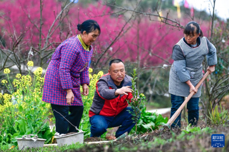 3月12日,吴光荣(中)与村民在贵州省龙里县颐光山林油茶生态园里补植油茶树。
