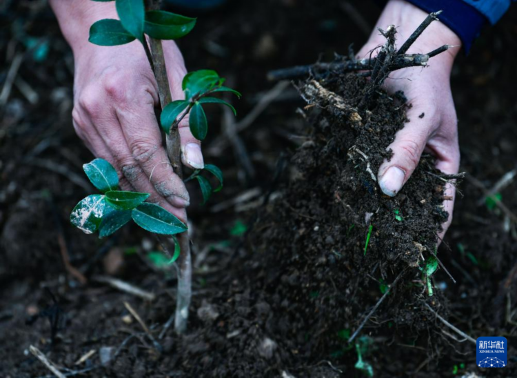 3月12日,吴光荣在贵州省龙里县颐光山林油茶生态园里补植油茶树。