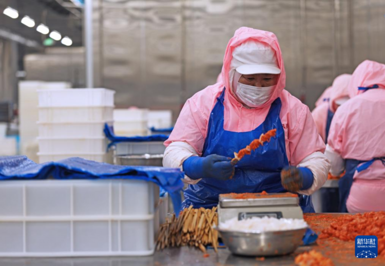 3月11日,在鞍山丰盛食品有限公司,工人在车间加工处理鸡肉串。