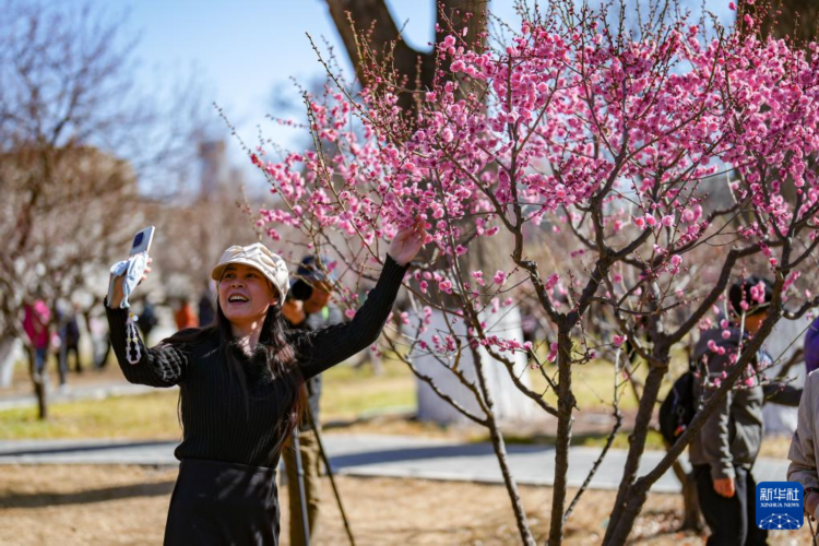 3月12日,一名游客在北京明城墙遗址公园赏花自拍。