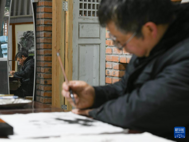 崇州皮影戏非物质文化遗产传承人杨勇在绘制“熊猫抱竹”设计草图(3月6日摄)。