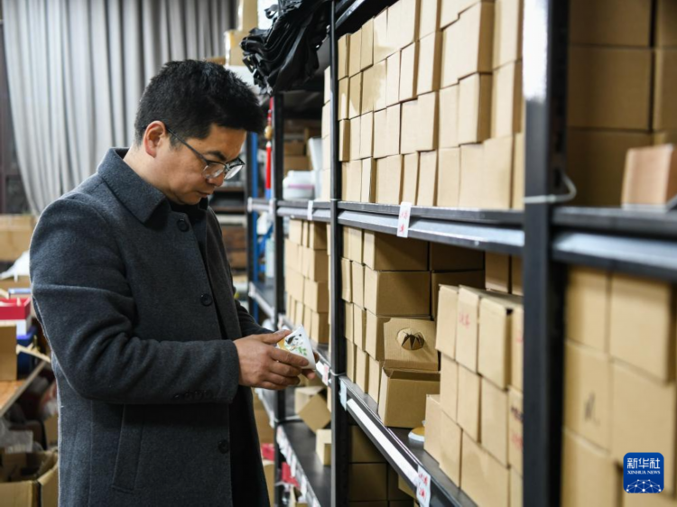 白静波在库房查看即将入库的“熊猫抱竹”盖碗茶杯成品(3月7日摄)。