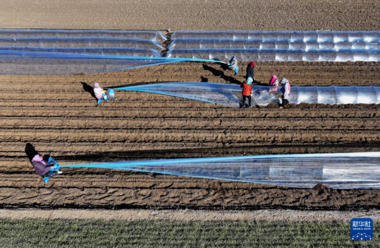 3月11日,丰南区岔河镇四神庄一村的农民在田间为刚播种的马铃薯覆膜(无人机照片)。