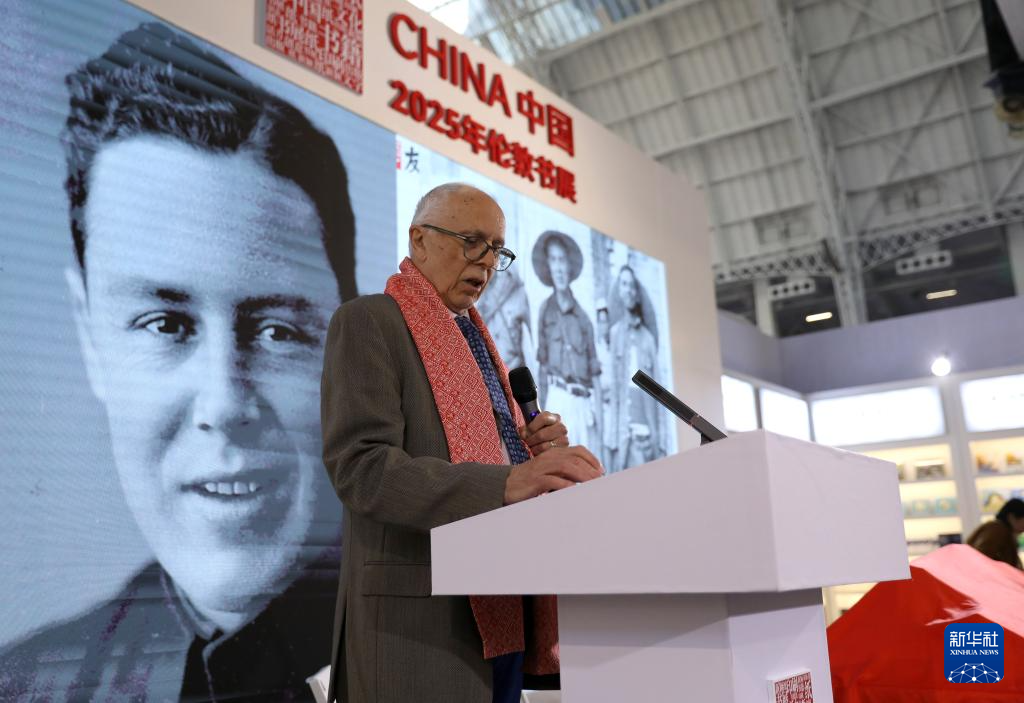 3月12日,在英国伦敦书展上举行的《原上草:乔治·何克的故事》中文版新书发布会上,该书英文原版作者、何克的外甥马克·埃尔文·托马斯致辞。新华社记者 李颖 摄