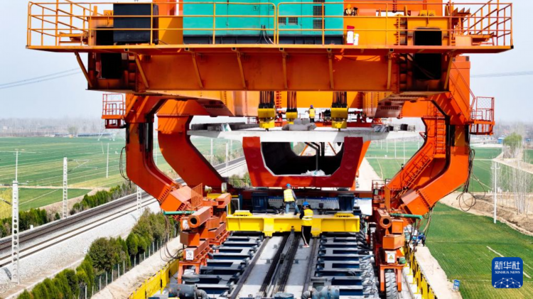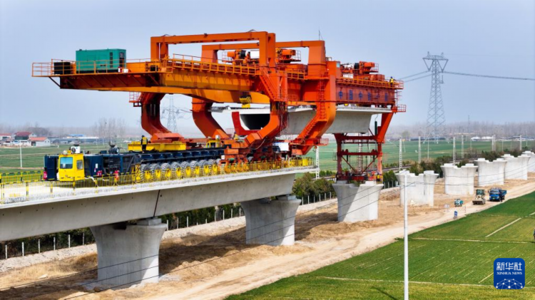 3月13日,在雄商高铁山东郓城县潘渡段,中铁十局的工作人员在进行架梁作业(无人机照片)。