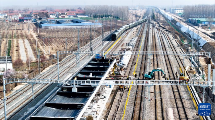 3月13日,在雄商高铁山东梁山站,中铁十局的工作人员在进行站台及附属设施施工(无人机照片)。